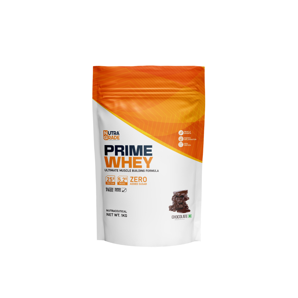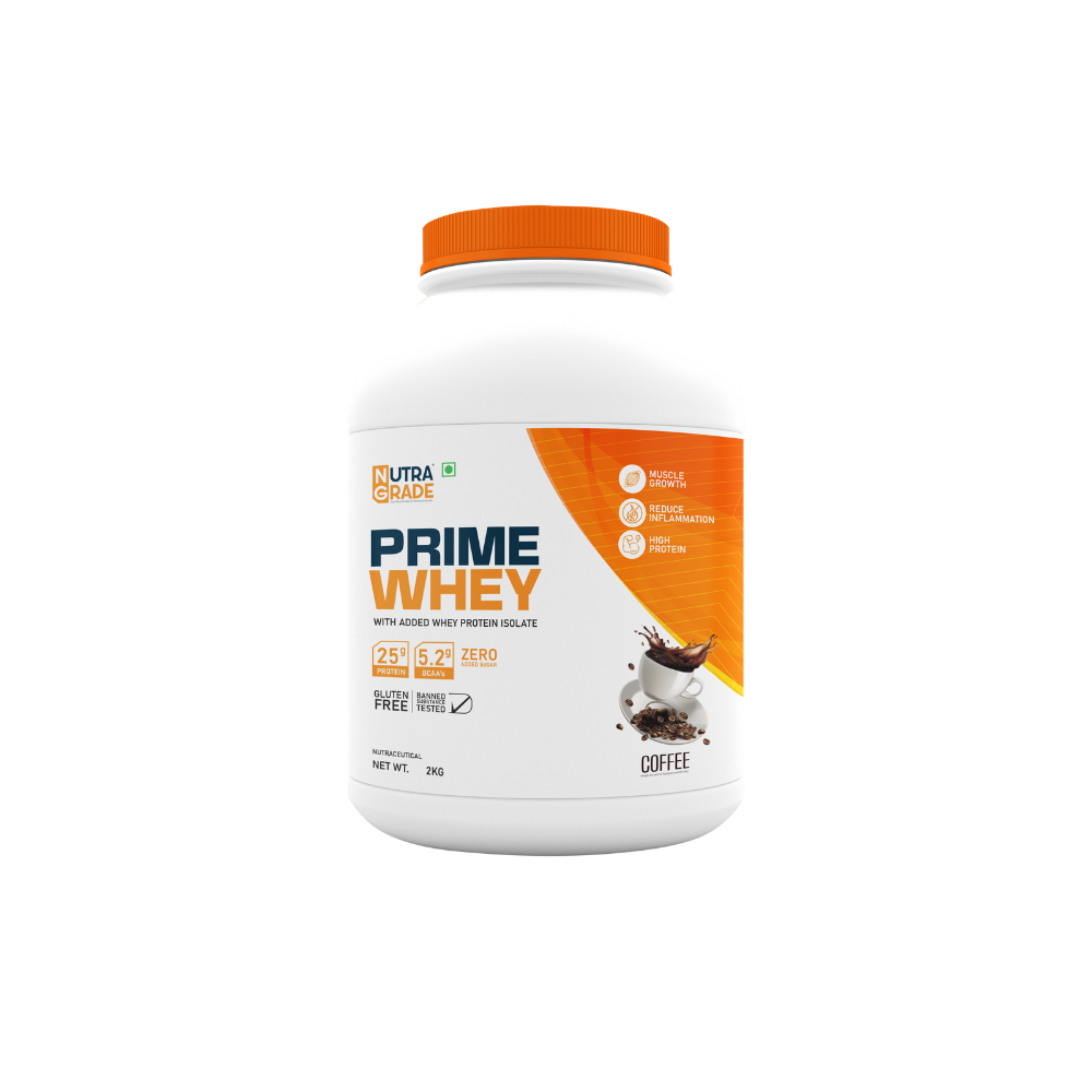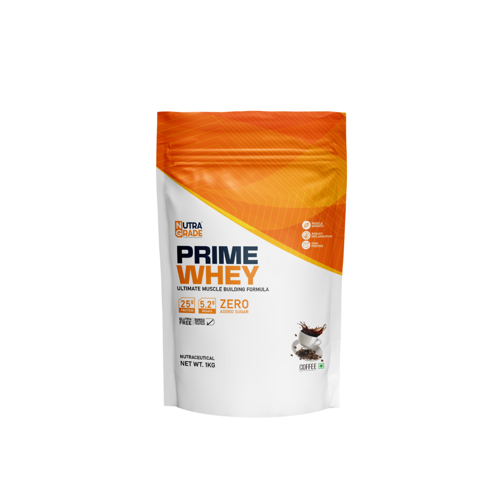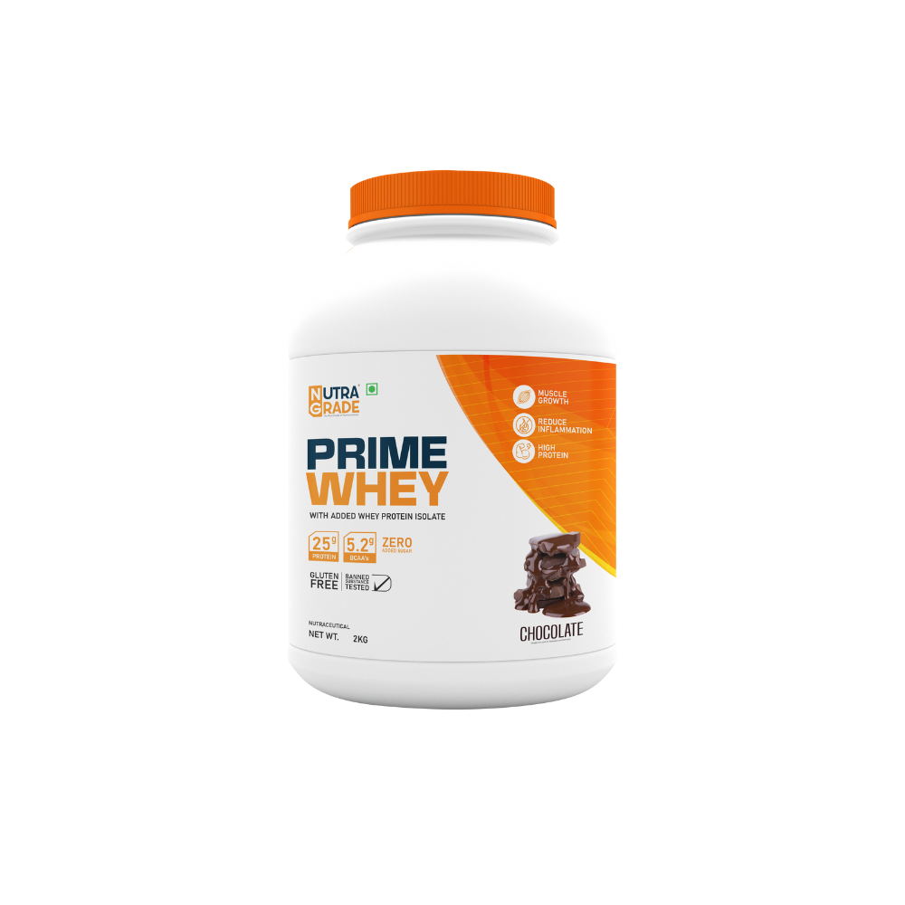 Upgrade your fitness game with NutraGrade PRIME Whey, a scientifically formulated blend of Whey Protein Concentrate + Whey Protein Isolate that delivers 25g of high-quality protein and 5.2g of BCAAs in every scoop.